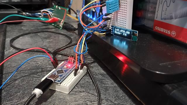 Hier noch auf dem Steckboard. Unten ist das Oled-Display und oben ist ein Temperatursensor. Dieser ist aber erstmal nur zu Testzwecken mit aufgesteckt. Hiermit möchte ich mir später noch die Betriebstemperatur des Funkgerätes anzeigen lassen. Aber erstmal nur die Freqenz und Modulationsart.