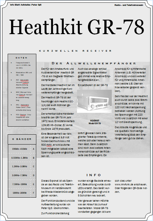 Ich habe auch einen Info-Blatt Aufsteller entworfen. Dort ist nochmal eine Zusammenfassung drauf. Also über den Heathkit GR-78. Der QR – Code zu dieser Homepage ist auf dem Aufsteller nicht vorhanden.
