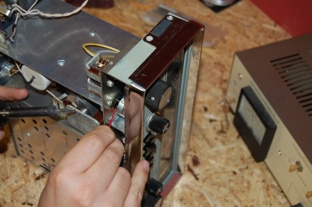 Also nach dem ich einiges durchgemessen hatte und von einen Kurzschluss auf den anderen gekommen war, habe ich die zwei Dioden ausfindig gemacht. Eine war hinüber und die andere war halt alt. Dies sind übrigens nicht die originalen Dioden. Denn da waren urspünglich eine ältere Version von Dioden verlötet. Die Skalendose habe ich auch etwas besser auf der Gelenkachse justiert. Das Sicherungslämpchen wurde ersetzt, zum Glück hatte ich noch eine in einer Bastellkiste. Das komisch gedrillte Drahtstück am Antennenausgang habe ich auch entfernt, denn das ist nicht so gut. Hier kann es schnell mal bei sehr starken Sendern in der Empfangsverstärkerstufe zum Schaden kommen. Ich ahne Schlimmes. Auch die 120 Volt Wechselspannung wird mit einem normalen Stecker wie hier in Deutschland und eigentlich Europa üblich ist gespeist. Ich ahne noch Schlimmeres. Aber da ich mich für die etwas ungefährlichere Art entschlossen habe, hab ich die 12 Volt Gleichspannungsversorgung genommen. ( Bei Spannungen oberhalb 50 Volt besteht Verletzungsgefahr. Und bei z.B. 230 Volt Wechselspannung ist ein Trenntraffo, welcher am besten zusätzlich noch regelbar ist wichtig! Aber so weit in der Technik möchte ich nicht hinein gehen. Soll ja keine Anleitung zum reparieren werden)