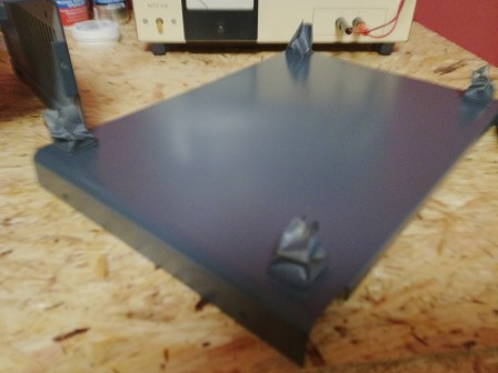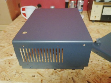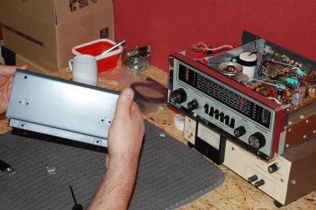 Jetzt musste aber das Gehäuse dran kommen. Erst war nur geplant alles etwas sauber zu machen, aber die Farbe auf dem Gehäuse war zu stark angegriffen und löste sich schon in eine schmierige Schicht auf. Also habe ich mich dazu entschlossen den Empfänger neu zu lackieren. Prozedur war klar, schleifen, reinigen, grundieren und lackieren. Nur die Rückseite war in einem guten Zustand und die Front wurde natürlich nur gereinigt.